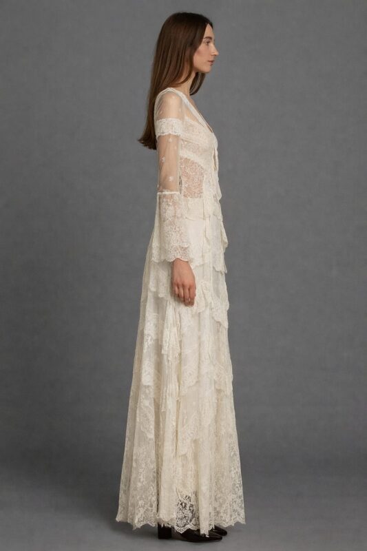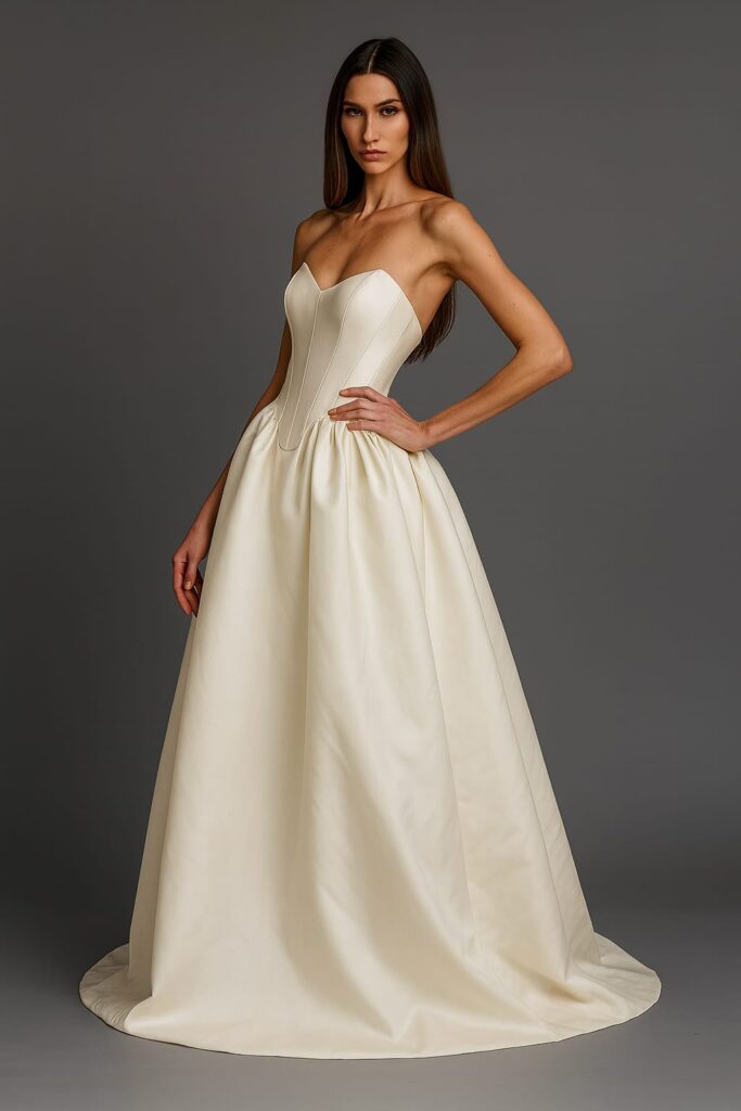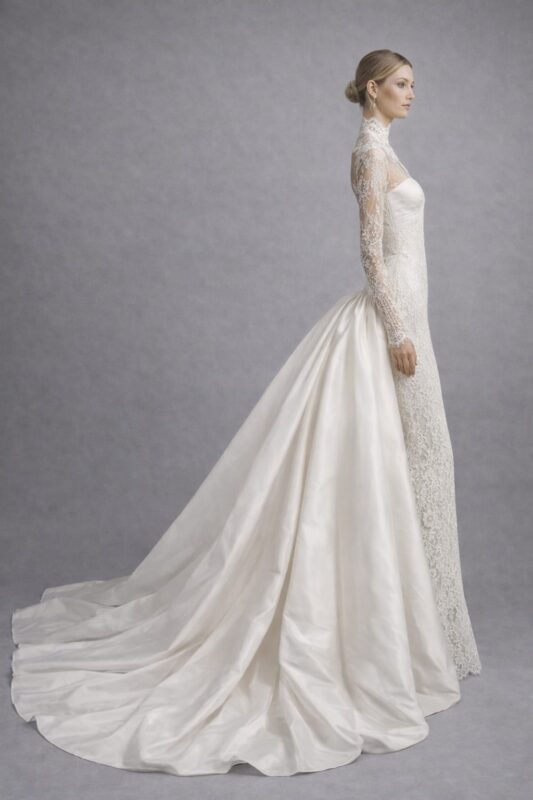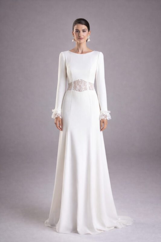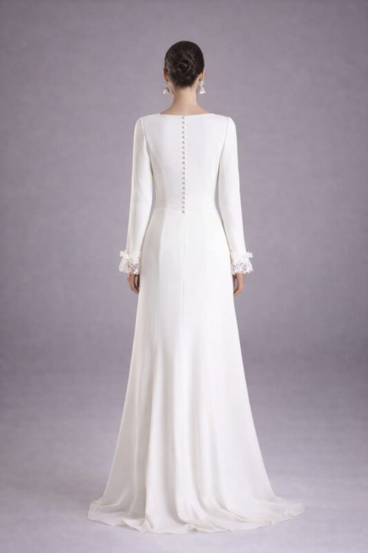 Cada diseño es el resultado de un proceso creativo meticuloso, en el que la precisión del corte, la calidad de los materiales y la armonía de la silueta dan forma a vestidos únicos, pensados para realzar la esencia de cada novia.