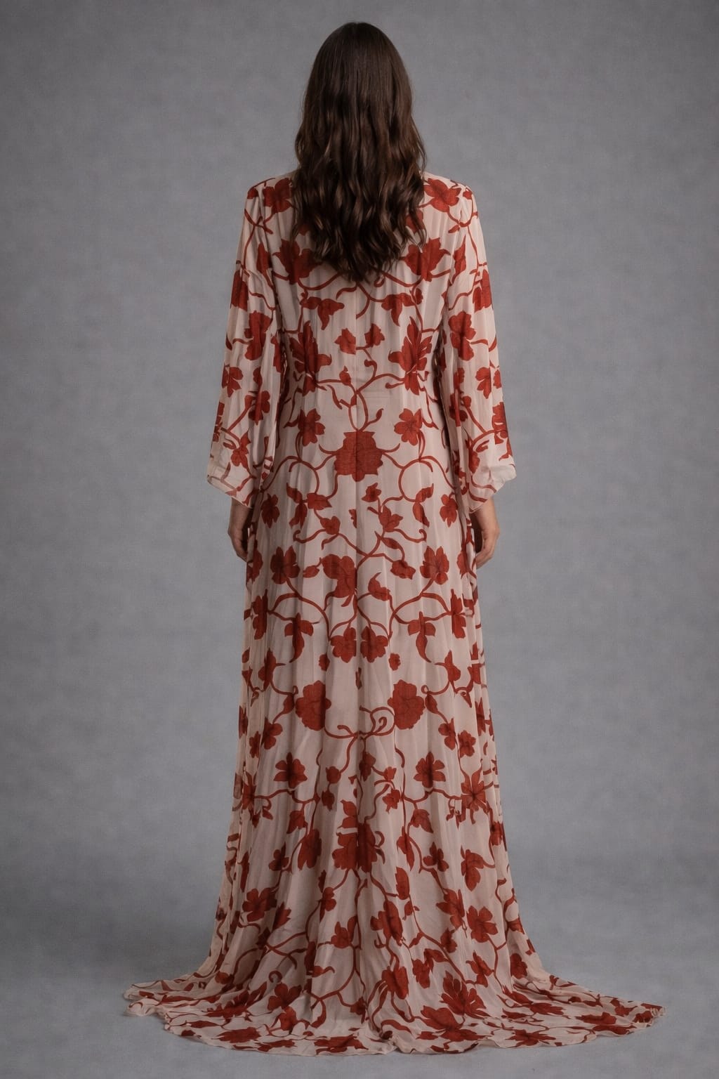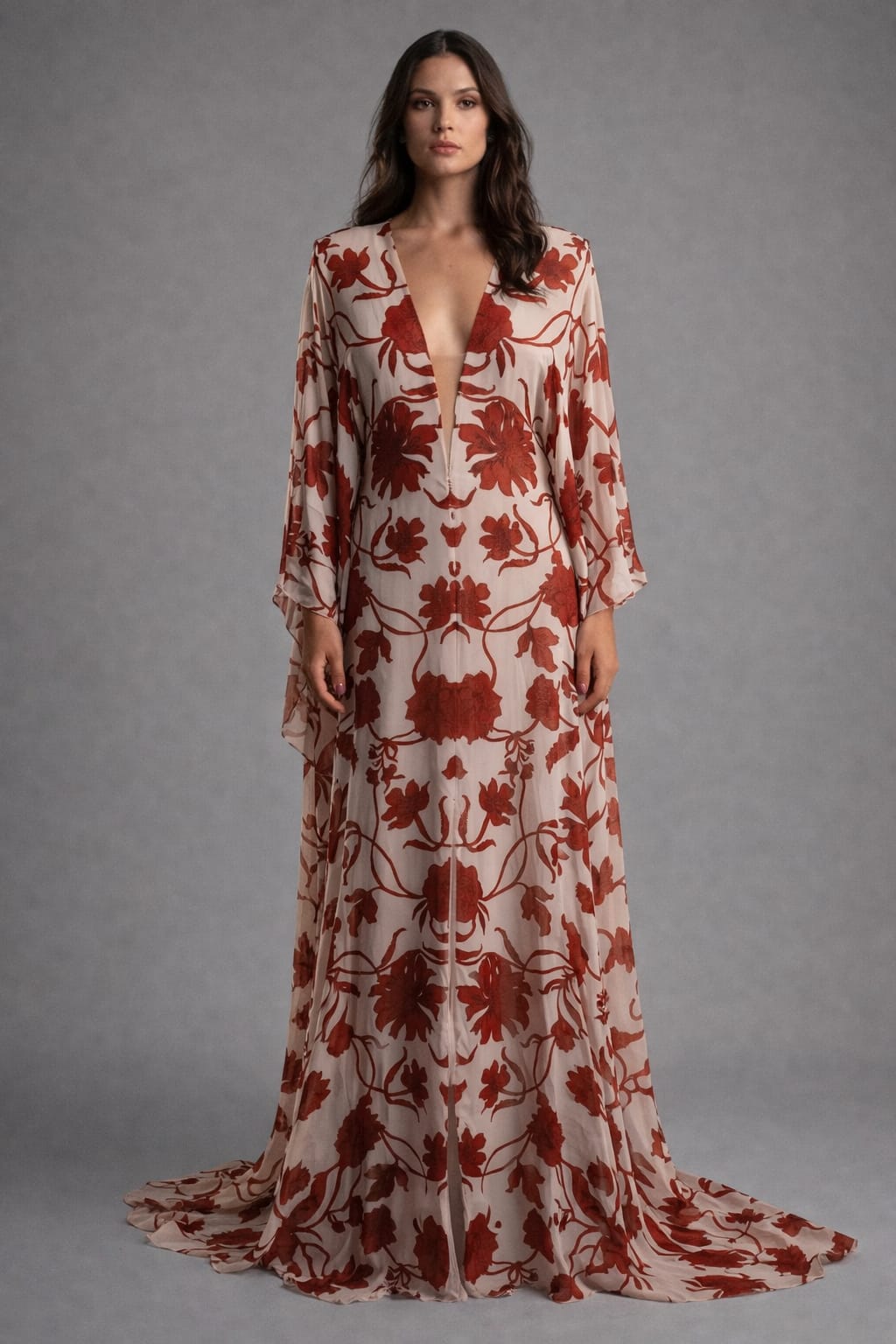 Kaftan largo fluido en tono marfil con estampado floral en rojo profundo. Destaca por su escote pronunciado, mangas amplias y caída ligera que aporta elegancia natural y sofisticación atemporal. Ideal para ocasiones especiales y eventos de estilo refinado.