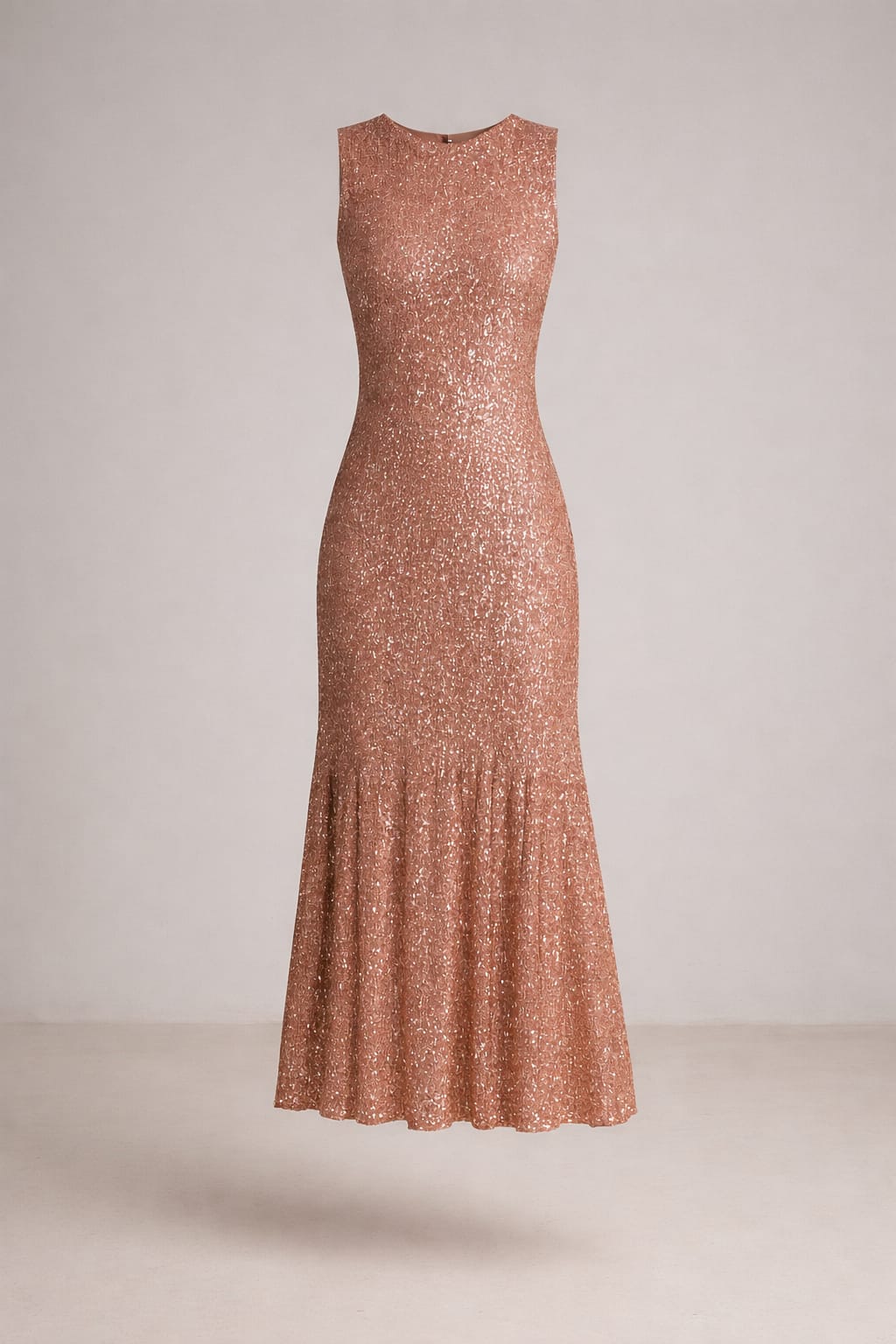 Vestido largo de lentejuelas en tono rose gold, de silueta estilizada que se ajusta suavemente al cuerpo y se abre delicadamente en el bajo. Un diseño sofisticado y luminoso que aporta elegancia y movimiento, ideal para ocasiones especiales y eventos de noche.