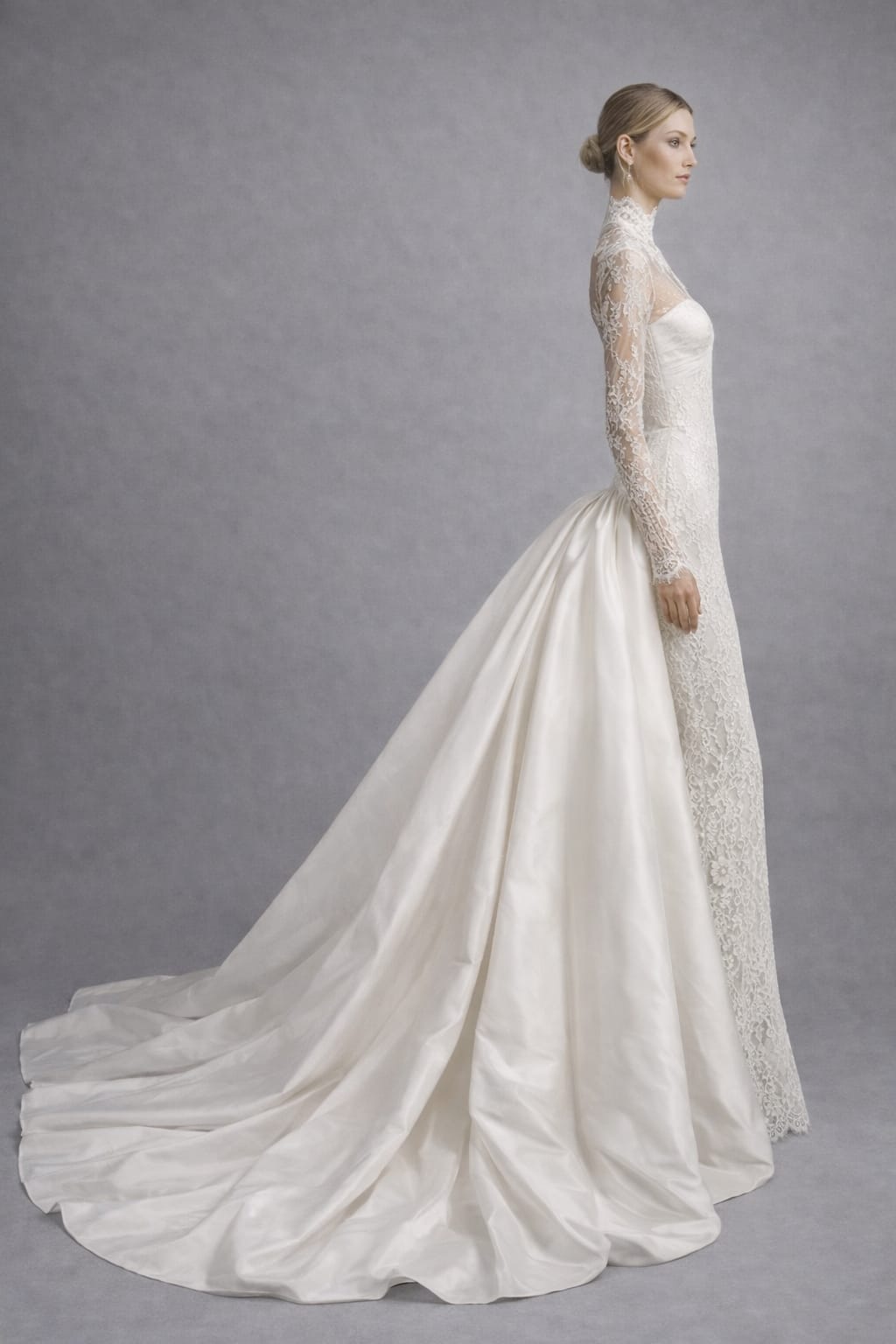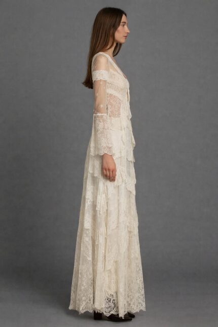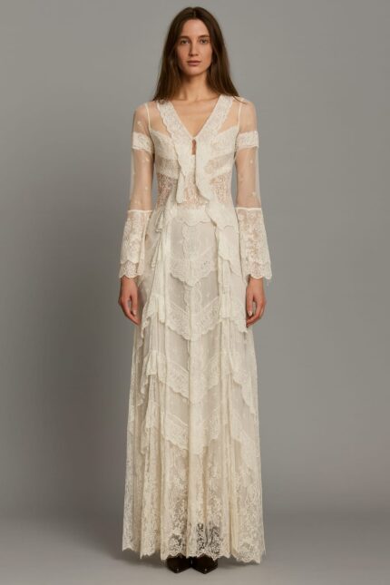 Vestido largo de encaje marfil de silueta estilizada, con delicado cuello alto y mangas largas transparentes que aportan un aire romántico y sofisticado. Un diseño refinado y atemporal que combina elegancia clásica con detalles sutiles, ideal para una ocasión verdaderamente especial.
